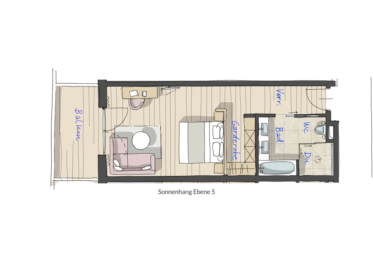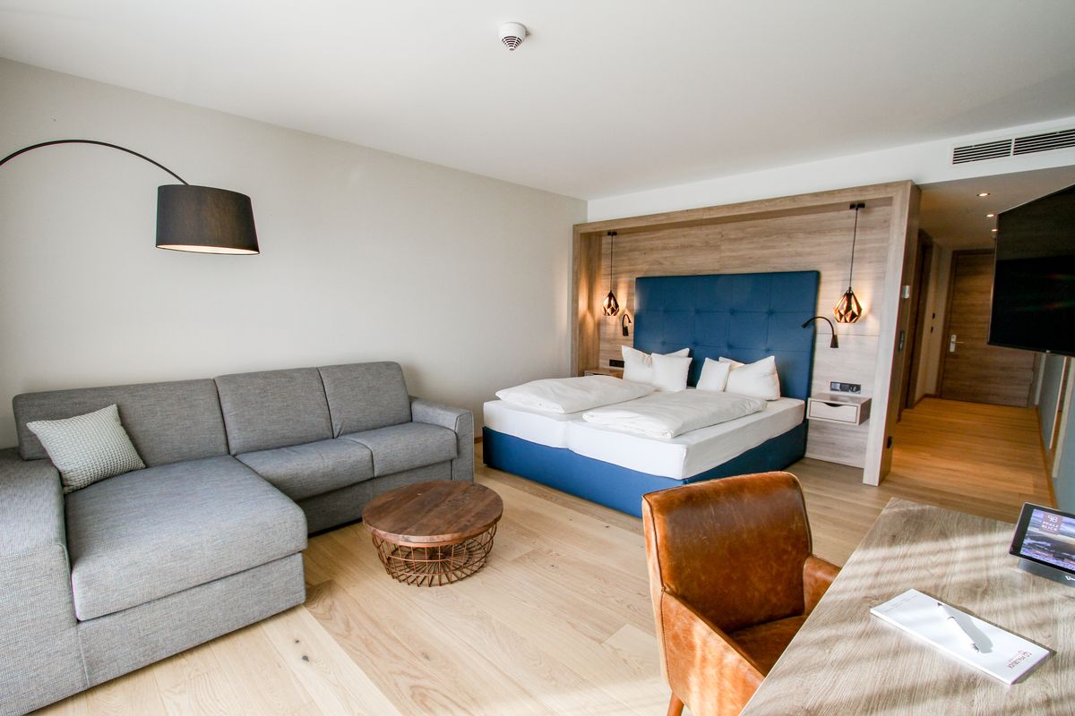 Die Zimmer sind 42m² groß und sind ausgestattet mit großem Bad mit Badewanne, Dusche, WC (auf Ebene 4 separat), Balkon (auf Ebene 5) bzw. Terrasse (auf Ebene 4), begehbarem Kleiderschrank, Safe, Telefon, WLAN, SuitePad, Kabel-TV, Minibar (für Sie inklusive), Wasserkocher für Tee- und Kaffeezubereitung, Klimaanlage und abgetrennter Sitzecke. Ein Zimmer auf Ebene 5 ist behindertengerecht ausgestattet, 4 Zimmer auf Ebene 5 sind barrierefrei.