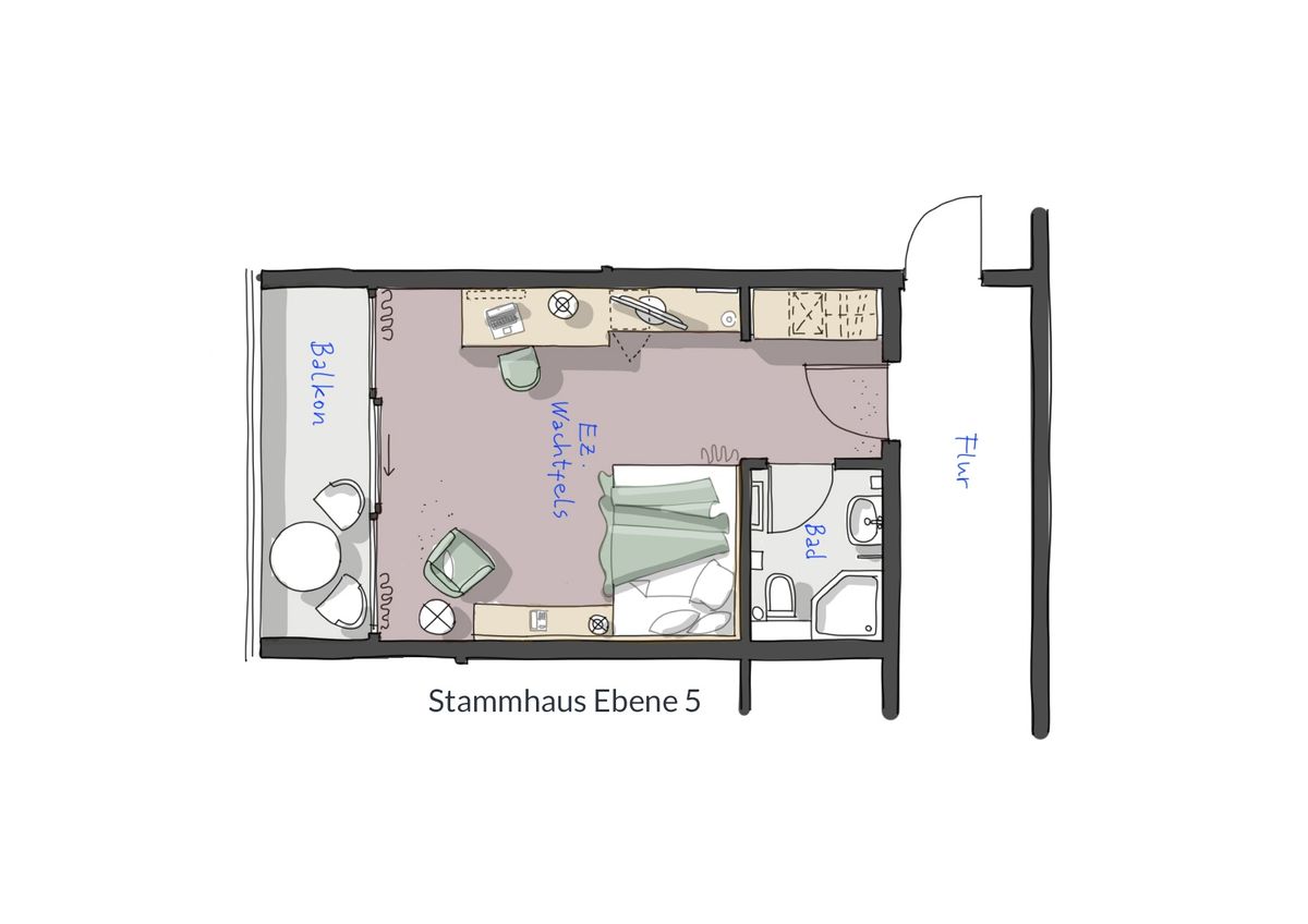 Die Einzelzimmer sind 19 bis 22 m² groß. Sehr kleiner, einfacher Sanitärbereich mit Dusche, WC, Föhn und Bademantel. Die Zimmer sind ausgestattet mit Balkon oder Terrasse, Telefon, kostenloser WLAN-Zugang, Suitepad, Kabel-TV, Radiowecker, Minibar (für Sie inklusive) und Zimmersafe.