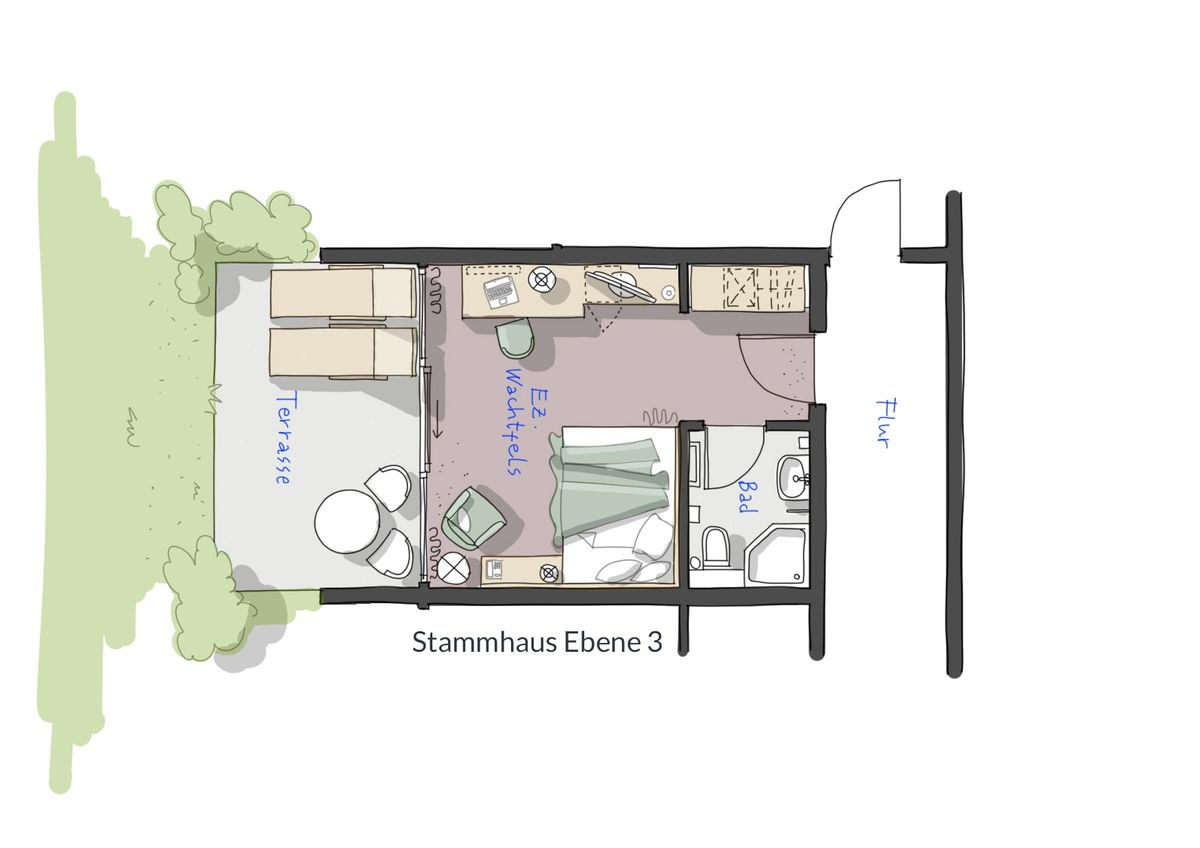 Das gemütliche Zimmer für Alleinreisende mit französischem Bett (140 cm breit) im Stammhaus.