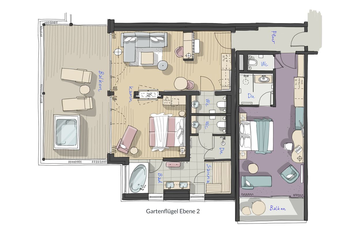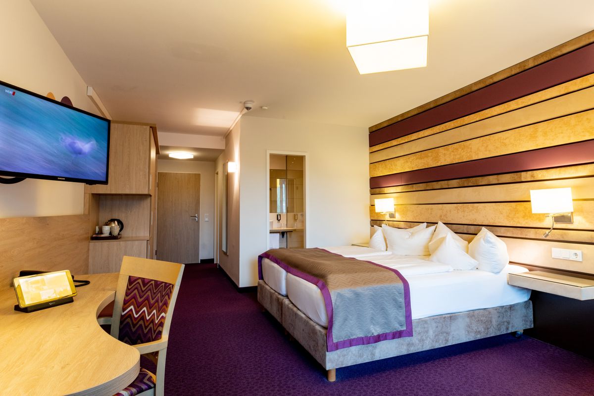 Durch eine Tür werden Spa Suite Römerfels und Doppelzimmer Tanstein auf Ebene 1 oder 2 miteinander verbunden. So bietet die Magnum Spa Suite Römerfels auf 118 m² viel Platz für eine entspannte Auszeit mit bis zu vier Personen.