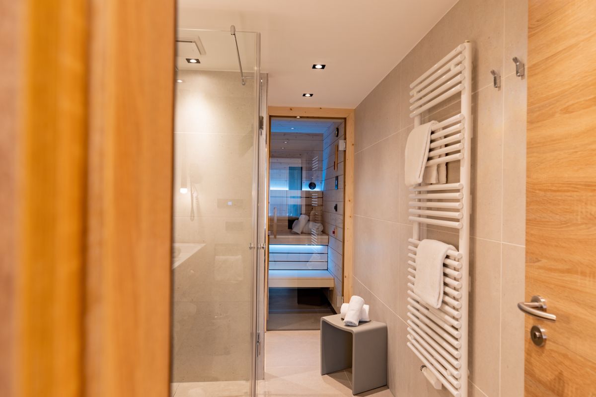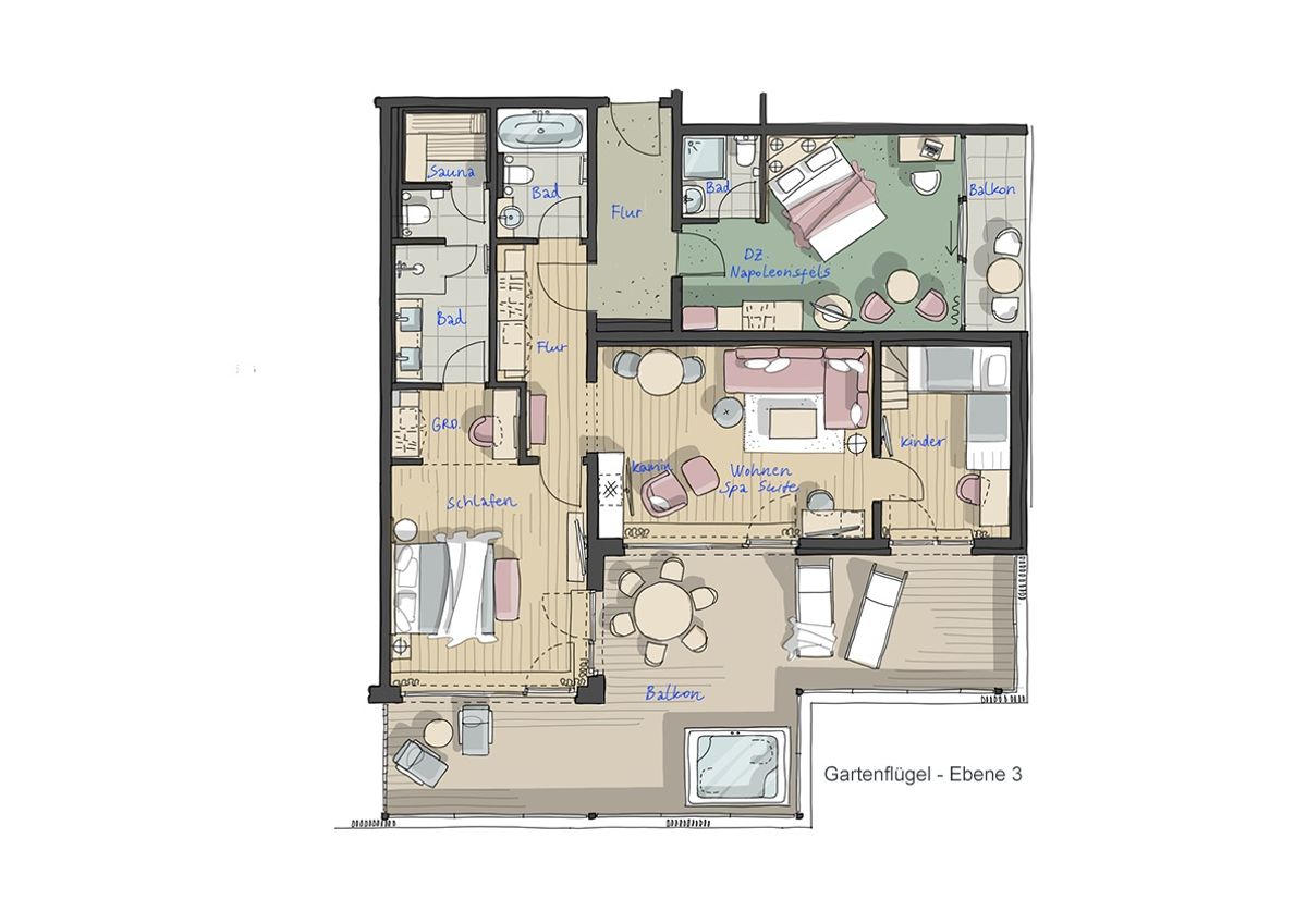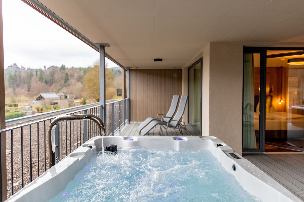 Die Family-Spa-Suite Römerfels auf Ebene 3 ist 97m² groß und ist ausgestattet mit einem Bad mit Dusche, Doppelwaschbecken und separatem WC und mit Sauna- und Infrarotkabine, mit einem zweiten Bad mit Badewanne und WC, Whirlpool auf dem Balkon, Safe, Telefon, WLAN, drei Smart-TVs, Minibar, Wasserkocher für Tee- und Kaffeezubereitung, Wein-Klimaschrank, Kamin, Klimaanlage und separatem Wohnzimmer. Außerdem verfügt die Family-Spa-Suite über ein Kinderzimmer mit Hochbett.